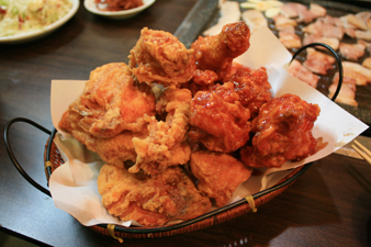 フライドチキンと、辛いタレを絡めたヤンニョムチキンの盛り合わせ。