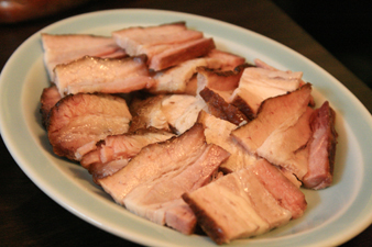 豚バラ肉をクヌギのチップで燻製してから焼いたもの。