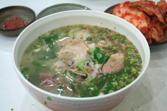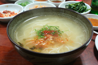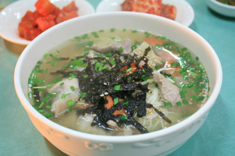 次は慶州で食べた、温かいスープのチョルミョン。