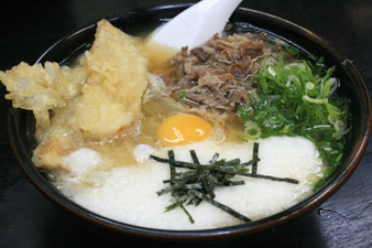 ごぼう天、牛肉、とろろ、生卵が入る豪華版です。