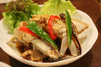 生のワタリガニを辛い薬味ダレに漬け込んだ料理です。