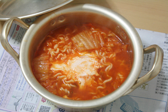 卵を落として、キムチも足して、下には新聞紙を敷きました。
