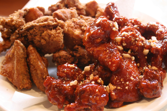 手前半分は甘辛いソースを絡めたヤンニョムチキン。