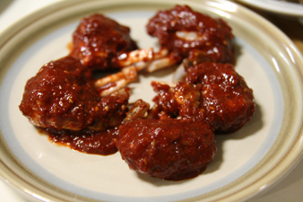 ワタリガニを生の状態で辛い薬味ダレに漬けた料理。