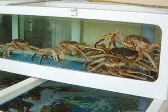 いきたズワイガニがいけすの中で、お客さんを待っています。