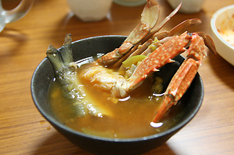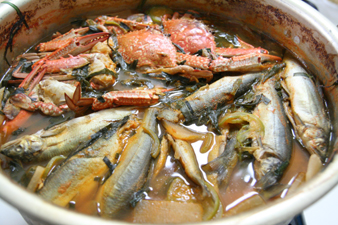 ソンチャンたちが、川でとれたシジミ、アユ、川ガニを使って、