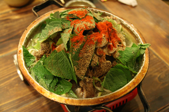 エゴマの葉と粉がたっぷりのカムジャタン(豚の背骨とジャガイモの鍋)。