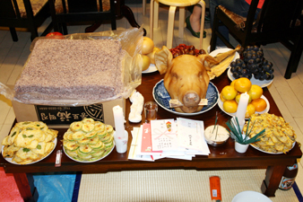 果物、餅、魚、ジョン(衣焼き)とともに、豚の頭を供えるのがポイント。