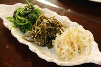 ナムル盛り合わせは、ホウレンソウ、緑豆モヤシに加え、