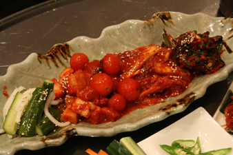 キムチの5種盛りは、珍しいミニトマトを中心にした組み立て。