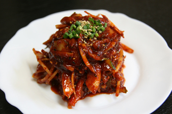 イカとタイの刺身を生野菜とともに辛いタレで和えています。
