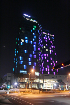 夜になるとホテルの外壁がライトアップされます。