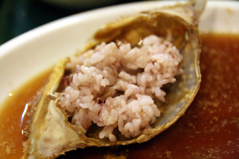 甲羅にごはんを詰め込み、混ぜ混ぜして味わいます。