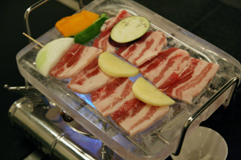 サムギョプサル(豚バラ肉の焼肉)も特注した小型の水晶板で焼きます。