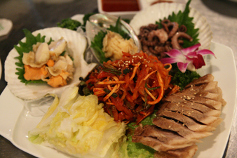 茹で豚の葉野菜包みに、ホタテ、アワビ、テナガダコの3品が、