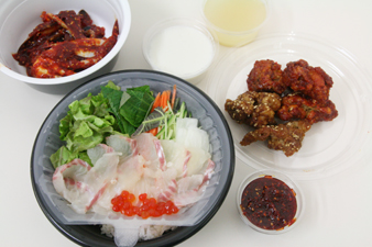 真鯛の刺身にイクラと生野菜がついて、辛いタレで混ぜて食べます。