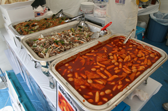 トッポッキ(餅炒め)やプルコギ(牛焼肉)などの料理が並び、