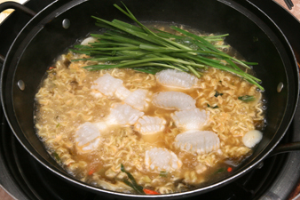 一緒にニラをゆがいて、韓方醤油で味わうのが韓国式。