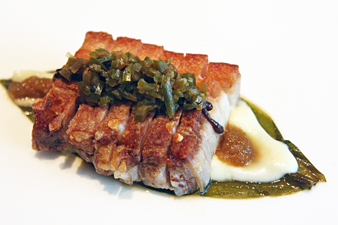 焼き目をつけた豚バラ肉に、刻んだピクルスを載せ、