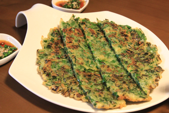 緑色の鮮やかなチヂミは店のイメージにもよく合いますし、