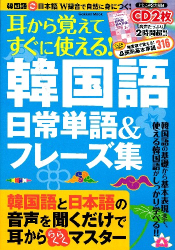 日常使用頻度が高く知っておきたい韓国語の単語・フレーズ集。CD2枚に日本語→韓国語のW録音の音声がたっぷり入っているので、耳から自然に韓国語が身につきます。ブックインブックの巻末付録には、学習者必携の頻度順必須単語帳つき!