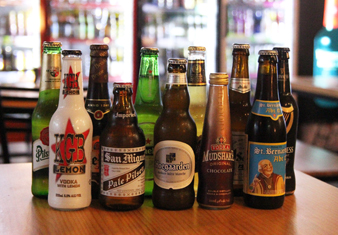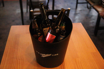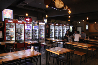 店の壁一面に小ビンのビールが入った冷蔵庫が並び、