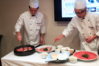 写真左で自ら肉を焼いていらっしゃるのが社長です。