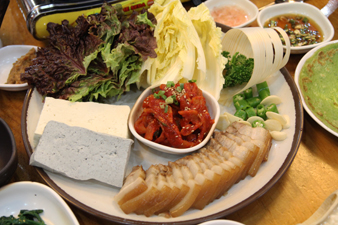 写真はそんな長湍豆を使ったトゥブポッサム(豆腐と茹で豚の葉野菜包み)。