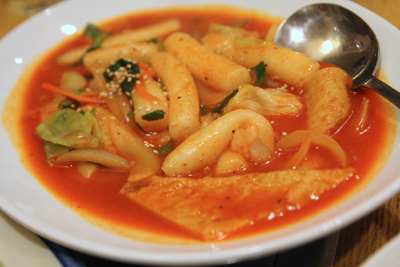 汁気のたっぷりとしたトッポッキ(甘辛の餅炒め、떡볶이)。