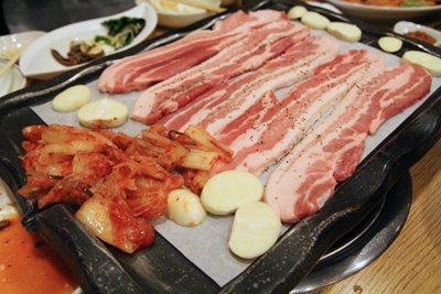 メイン料理にサムギョプサル(豚バラ肉の焼き肉、삼겹살)。