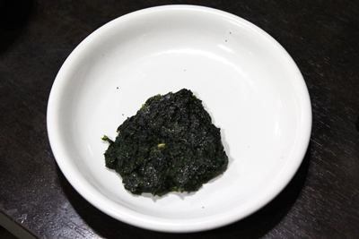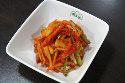 ・スッキムチマリ(ヨモギクレープのキムチ巻き、쑥김치말이)左