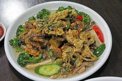 揚げた野菜、山菜、キノコなどを甘酢ソースで絡めたもの。