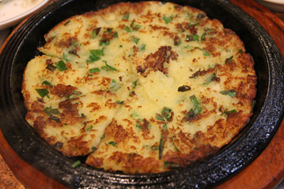 子どもがいるため、辛くないメニューを中心に組み立てたのですが、この日、焼肉よりも人気を集めたのが、カムジャジョン(ジャガイモチヂミ、감자전)でした。