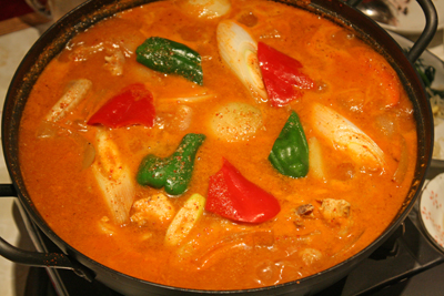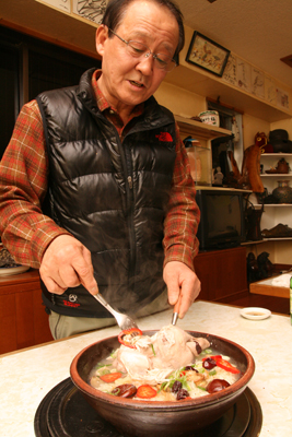 お母さんいわく、大事なのは冷凍の鶏を使わず、国産の丸鶏を注文ごとにぶつ切りすることとか。醤油、コチュジャン、粉唐辛子などでピリ辛に味付けをして、じっくり煮込めばできあがりです。