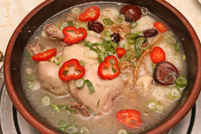 人数が多ければ、タッペクスク(丸鶏の水炊き、닭백숙)もぜひ。鶏肉は塩につけて食べ、スープにはごはんを入れてお粥として食べます。