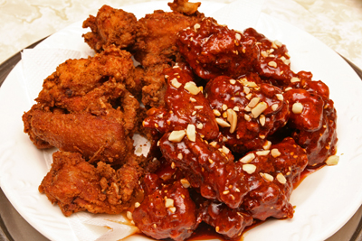 もっと大勢なら、ヤンニョムチキン(フライドチキン甘辛ソース、양념치킨)もいいですね。フライドチキンとのパンバン(ハーフ&ハーフ)で注文すると両方の味で楽しめます。