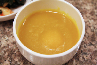 さて、料理の順番は前後しますが、コースの最初に出てきたのはホバッチュク(カボチャ粥、호박죽)。よく目を凝らしていただければわかると思いますが、ペースト状になったカボチャ粥の中に白玉が入っています。