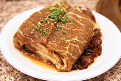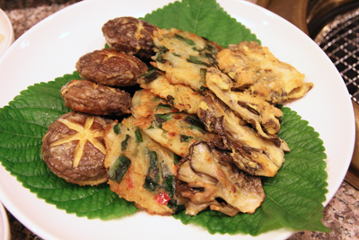 モドゥムジョン(チヂミの盛り合わせ、모둠전)は、左からシイタケの肉詰め、ニラと裂きイカ、マイタケという3種。シイタケはともかく、裂きイカは珍しいですし、韓国でマイタケはあまり見ないですね。食感のよいキノコだけに、シイタケとはまた違った魅力がありました。
