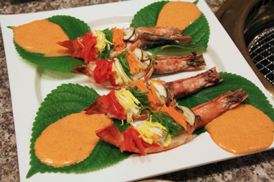 ということで秋の料理がメイン。冒頭の写真はいちばん評判のよかったセウチム(エビの蒸し物、새우찜)です。宮中料理をアレンジしたもので、エビの蒸し物に5色の食材をトッピングし、コチュジャンマヨネーズのソースを添えてあります。