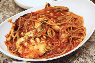 この日のメインは、ワタリガニやエビ、ムール貝、イカのどっさり入ったヘムルチム(海鮮の蒸し煮、해물찜)。韓国ではオスのワタリガニや、エビが秋の食材として知られます。