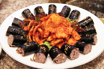 食事メニューに五穀ごはんのチュンムキムパプ(ひと口海苔巻き、충무김밥)。慶尚南道統営市の郷土料理で、具のないひと口大の海苔巻きを、カクトゥギ(大根の角切りキムチ、깍두기)や、オジンオムチム(イカの和え物、오징어무침)などと味わいます。