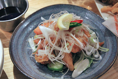 写真はハーフサイズでフライドポテトが添えられています。衣の中に刻んだ青唐辛子が入っていてヒリヒリ辛いのが特徴。これがまた油っ気をさっぱりさせるとともに、食べられないほどに痛いわけでもなく、絶妙にビールをぐいぐい進ませるという刺激になっていて……。