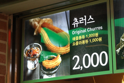 いちばんシンプルなオリジナルチュロスがW2000。チョコレートソースや、アイスクリームなどのトッピングもできます。