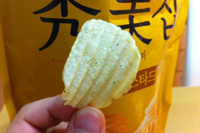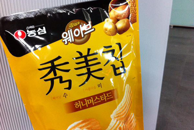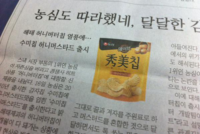 上の写真は訪韓中に発見した新聞記事。ハニーバターチップの大ヒットにより、他社も負けじと類似商品を準備中とは聞いていましたが、その中で一歩先んじたのが農心でした。人気商品の「秀美チップ(수미칩)」からハニーマスタード味を出すとの内容で……。