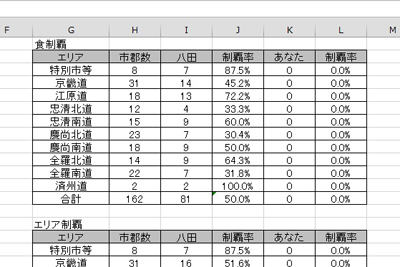 やり方は簡単で、「あなた」と書かれた列に「★」マークをコピペしていくだけ。また、使い分け用として「☆」マークもあり、これはその地域に行ったけど食事をしなかったという場合につけています。すると右の表に、「食制覇(その土地で食べた)」と「エリア制覇(食べなかったけど足を運んだ」というふたつのまとめができあがる仕組み。