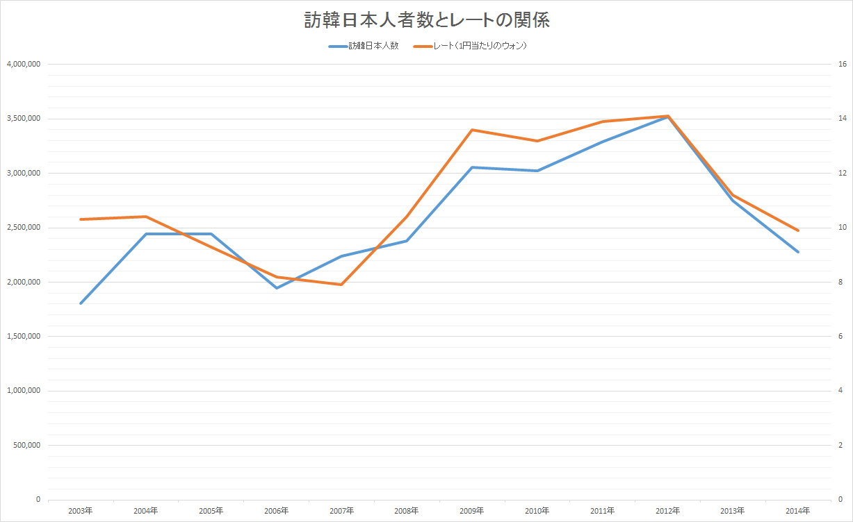 年 訪韓日本人数 レート(1円当たりのウォン) 2003年 1,802,542 10.3 2004年 2,443,070 10.4 2005年 2,440,139 9.3 2006年 1,948,819 8.2 2007年 2,235,963 7.9 2008年 2,378,102 10.4 2009年 3,053,311 13.6 2010年 3,023,009 13.2 2011年 3,289,051 13.9 2012年 3,518,792 14.1 2013年 2,747,750 11.2 2014年 2,280,434 9.9