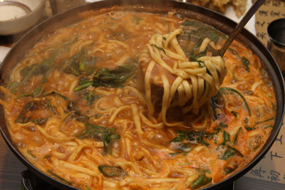 お昼ごはんはセンソングクス(魚スープうどん、생선국수)。川魚を煮込んですりつぶし、どろどろにしたスープにうどんを入れたものです。ちょっと辛いかなと心配しましたが、それよりも濃厚な魚の味わいが勝ち、みなさん美味しいと召し上がっていただきました。