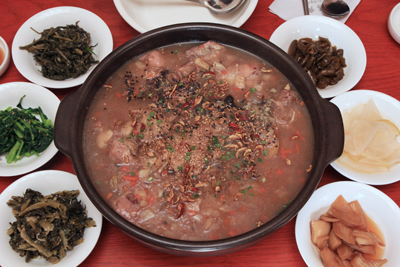 そのまま山城内の細い路地に分け入って、大型バスの運転手さんを苦しめながら、ようやくたどり着いた昼食がコレ。南漢山城エリアの名物であるタットガニ(鶏粥鍋、닭도가니)です。たくさんの韓方材と煮込んでおり、栄養満点であるとともに、その味わいも絶品でした。