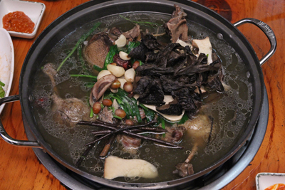 コウタケは卸値で1kg16万ウォンもするという希少なキノコで、いちばん上に載っている黒いものがそれ。そこに高麗人参、ナツメ、鹿角(녹각)、ハリギリ(엄나무)、キバナオウギ(황기)といった韓方を加え、じっくり煮出したスープでアヒルを丸ごと水炊きにした料理です。