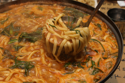 昼食は同じく利川にて地元の方が通うセンソングクス(魚スープ麺、생선국수)の店へ。内陸部ではよく見る調理法ですが、いろいろな川魚を煮込んでダシをとるとともに身はすりつぶし、味噌などで味付けをしたどろどろ濃厚スープに麺を入れた料理です。